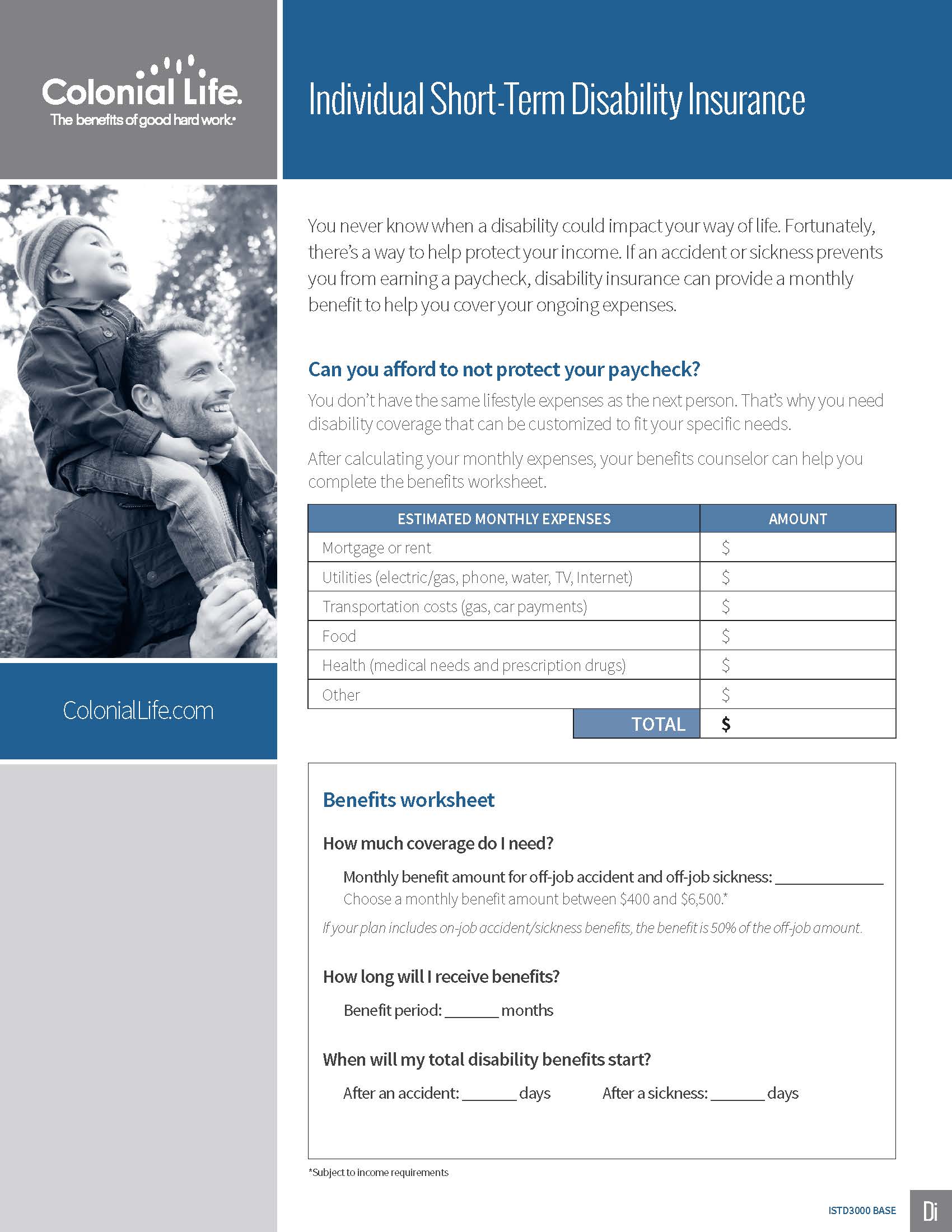 Short Term Disability Income Insurance provides you with benefits to replace part of your paycheck when you can’t work because of an off-the-job injury, illness, or maternity leave. This coverage is intended to provide financial protection if you were unable to work.