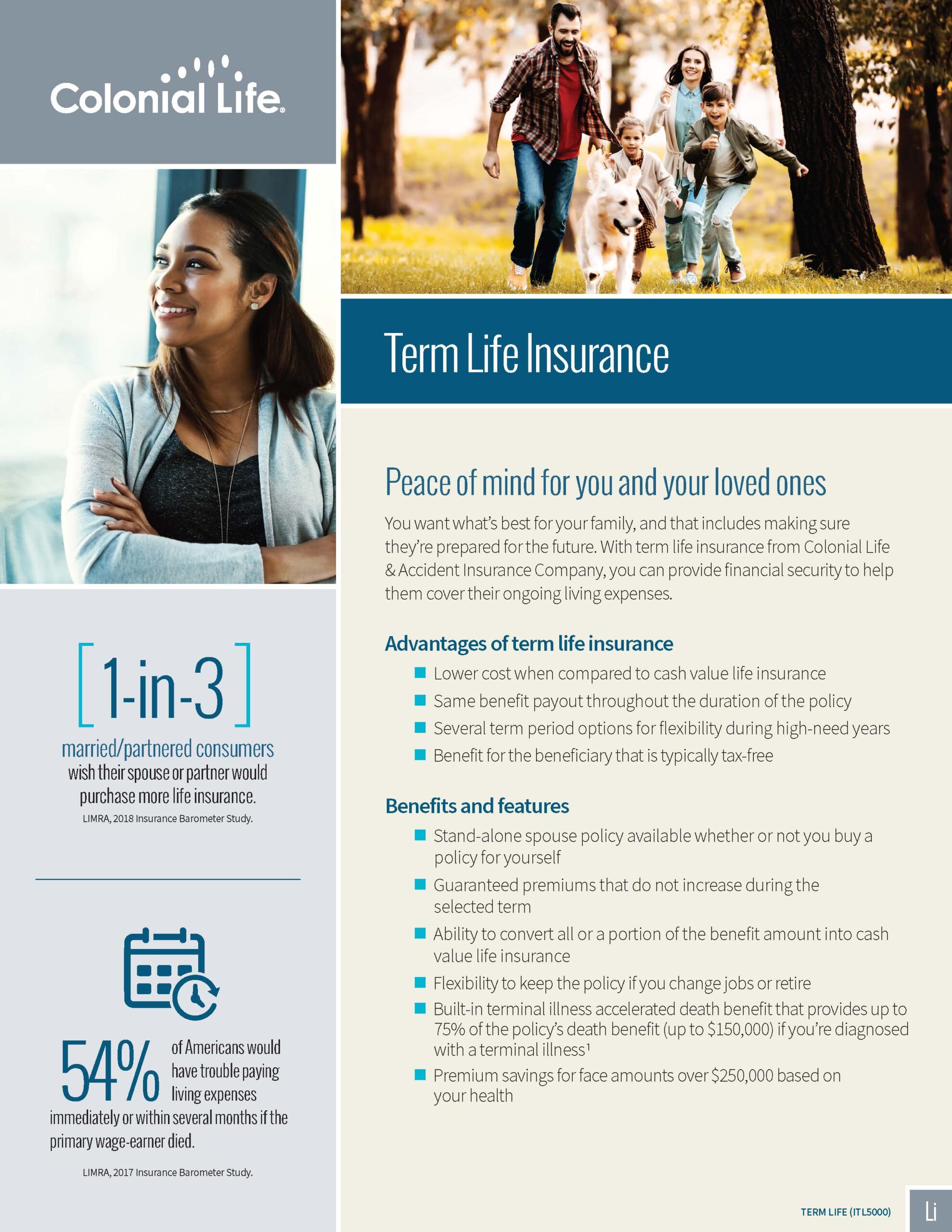 How would your family “make ends meet” should your untimely death occur? This plan offers Guaranteed Level premiums for the term period – the rate does not increase. You can also request an Accelerated Death Benefit of 75% of the benefit amount if you are diagnosed with a terminal illness. Spouse and dependent coverage available.